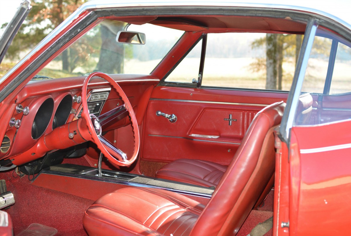 [IMG2=JSON]{"data-align":"none","data-size":"full","height":"390","width":"630","src":"https:\/\/barnfinds.com\/wp-content\/uploads\/2018\/12\/camaro5-630x390.jpg"}[/IMG2] The seller claims the red-on-red combination is rare and that the interior is deluxe and completely original. No rips or tears are visible in the seat coverings and the carpet still looks plush. The black vinyl covering the console is faded, but no worse than what is typically found in a car less than half its age. The dash seems to be the area that’s suffered the worst, showing significant discoloration in a few spots. Pictures don’t show any cracks in the vinyl covering, however, and that’s good news. All of the glass is said to be original although the seller reports a scratch in each door window and a wiper mark on the windshield. The factory-installed AC is “all hooked up but does not blow cold” according to the seller.