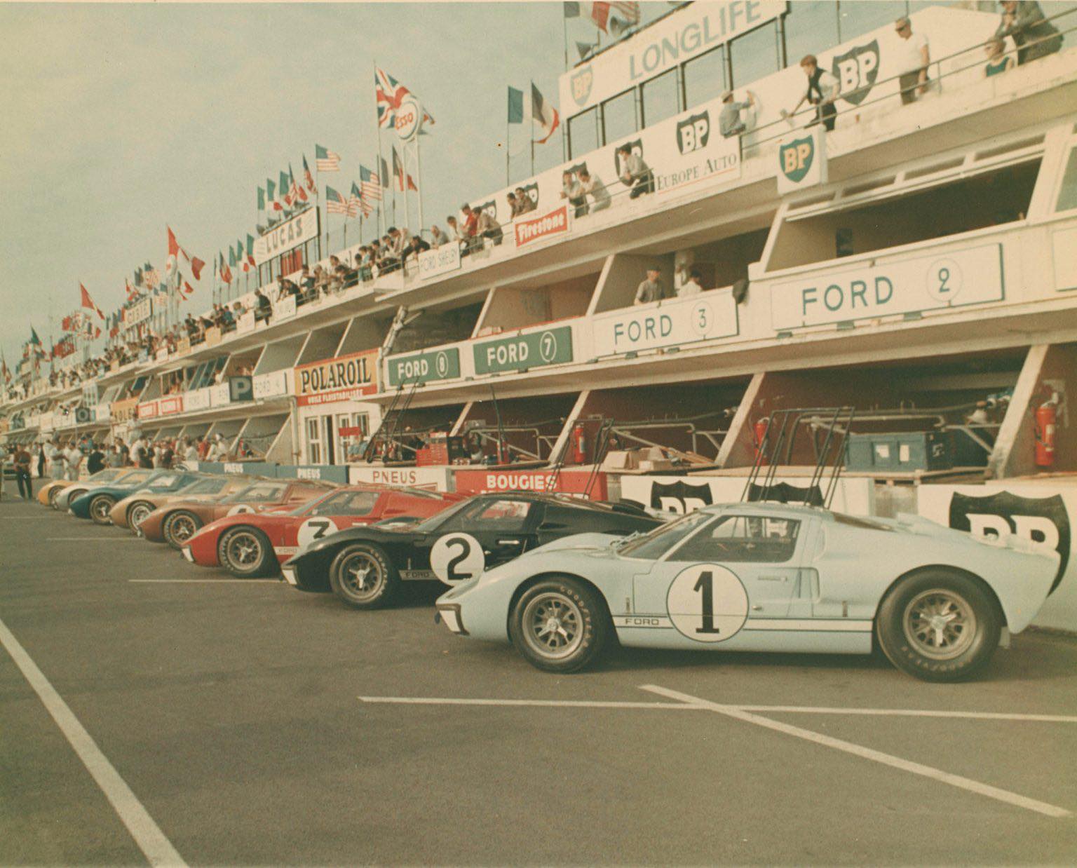 The three Shelby American team cars and the privateers GT40's, owned by, Holman-Moody with three cars, and Alan Mann Racing with two. All the teams were supported by Ford, for the 1966 Le Mans event.